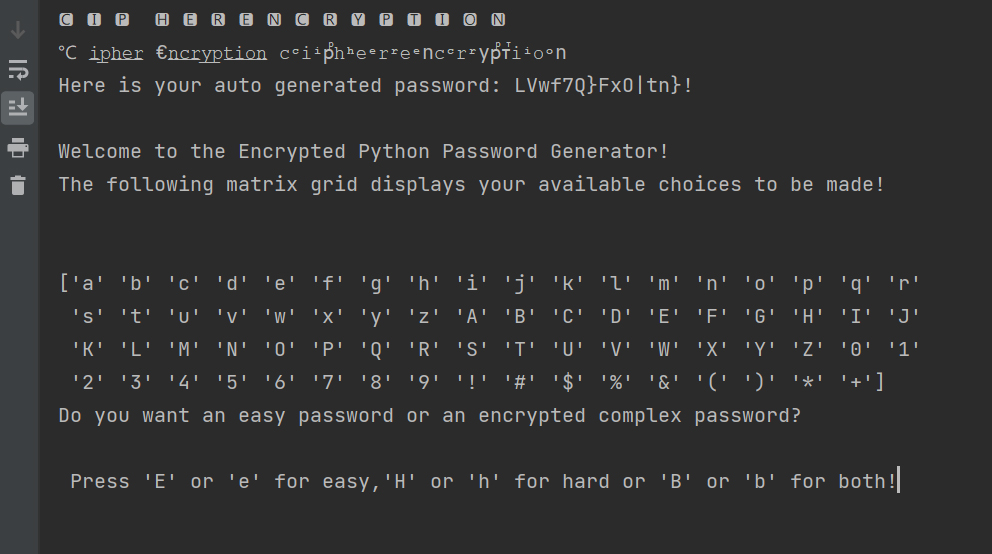 print("Welcome to the Encrypted Python Password Generator!\nThe following matrix grid displays your available choices to be made!\n\n")